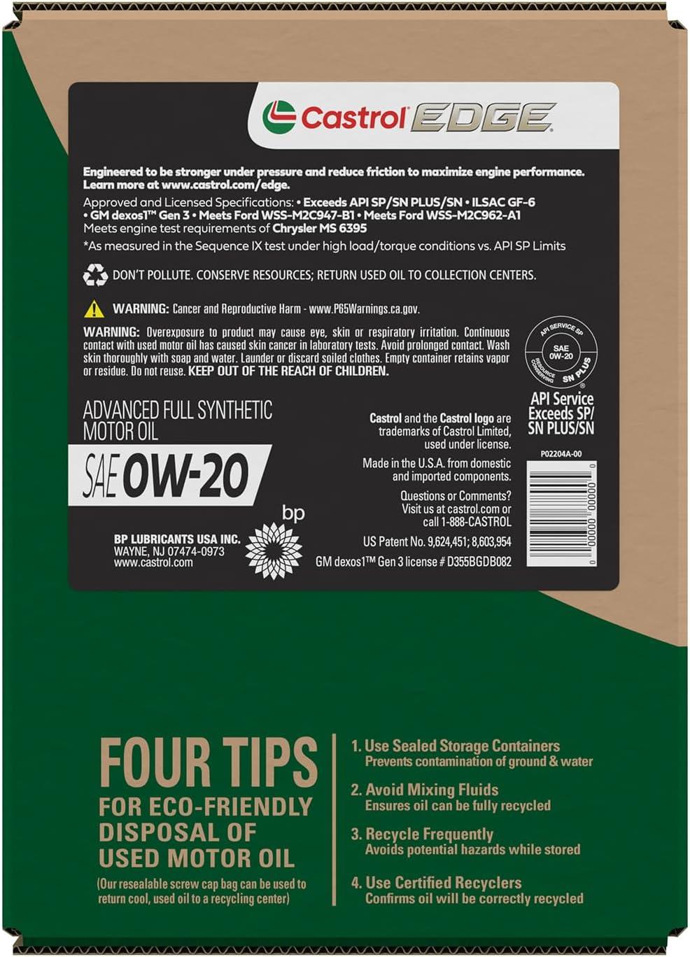 Castrol® EDGE® 0W-20 is an advanced full synthetic motor oil and the optimal choice for drivers who want the best combination of wear protection, viscosity control and thermal stability to maximize engine performance. It's formulated to provide Superior Performance and Protection in 7 Critical Areas including fuel economy, high temperature performance, sludge control and wear protection.