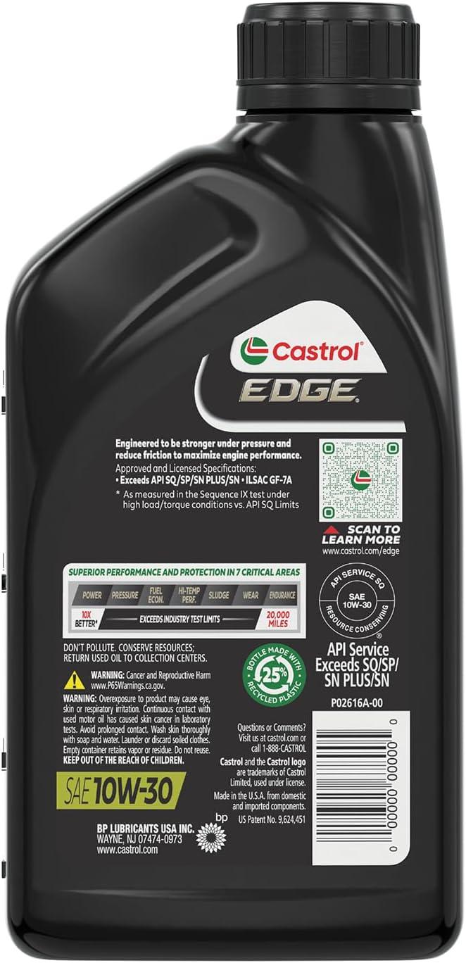Castrol® EDGE® 10W-30 is an advanced full synthetic motor oil and the optimal choice for drivers who want the best combination of wear protection, viscosity control and thermal stability to maximize engine performance. It's formulated to provide Superior Performance and Protection in 7 Critical Areas including fuel economy, high temperature performance, sludge control and wear protection.