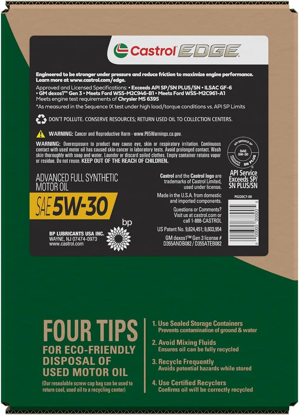 Castrol® EDGE® 5W-30 is an advanced full synthetic motor oil and the optimal choice for drivers who want the best combination of wear protection, viscosity control and thermal stability to maximize engine performance. It's formulated to provide Superior Performance and Protection in 7 Critical Areas including fuel economy, high temperature performance, sludge control and wear protection.