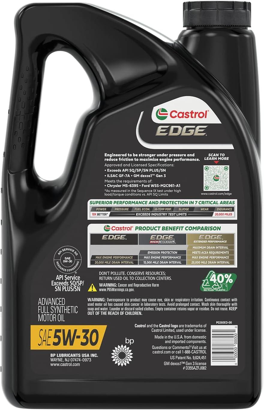 Castrol® EDGE® 5W-30 is an advanced full synthetic motor oil and the optimal choice for drivers who want the best combination of wear protection, viscosity control and thermal stability to maximize engine performance. It's formulated to provide Superior Performance and Protection in 7 Critical Areas including fuel economy, high temperature performance, sludge control and wear protection.