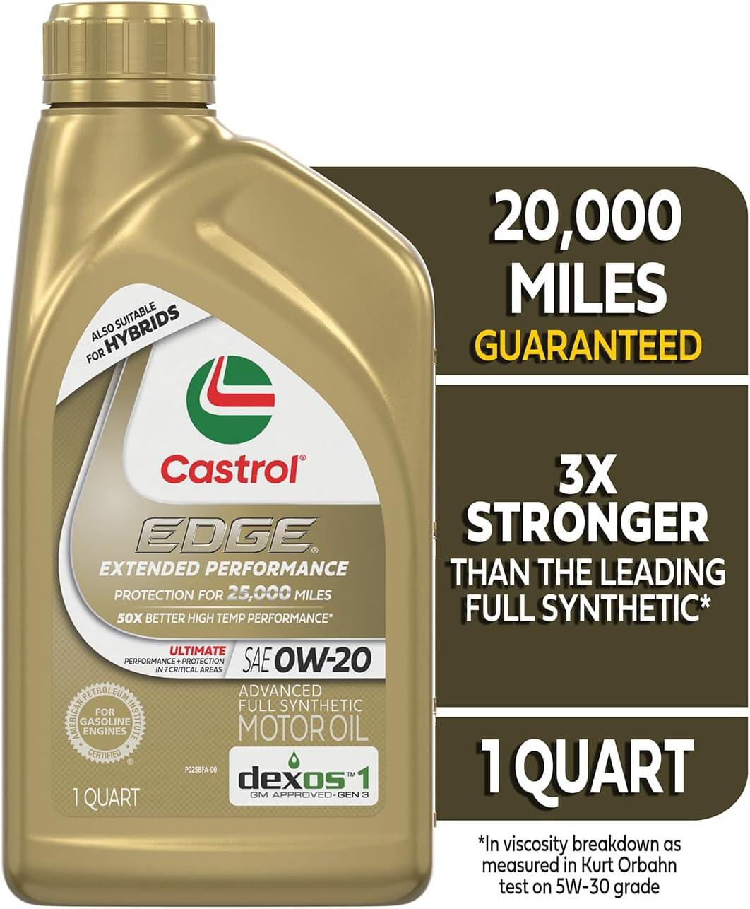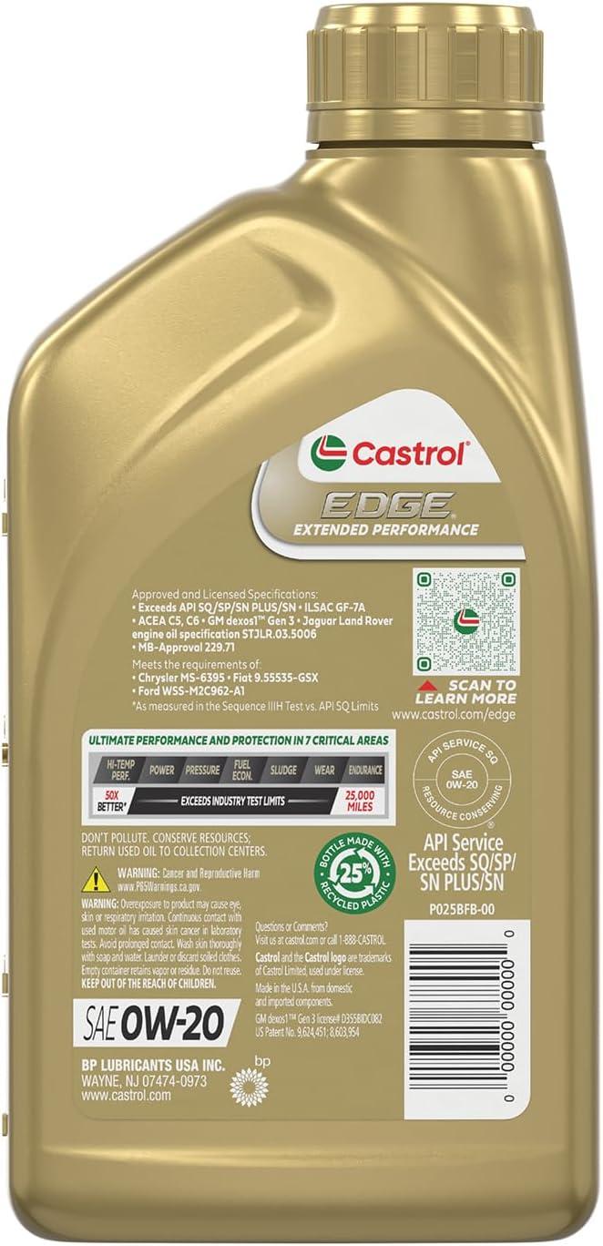 Castrol® EDGE® Extended Performance 0W-20 is an advanced full synthetic and Castrol®'s strongest motor oil. This hyper premium lubricant exceeds API and GM dexos test limits as well as the performance requirements of ACEA, the world's most demanding motor oil specification. Boosted with our proprietary additive technology, it provides Ultimate Performance and Protection in 7 Critical Areas including the highest level of wear protection and thermal stability along with the strength to maintain your vehicles performance for an extended drain interval of 25,000 miles.