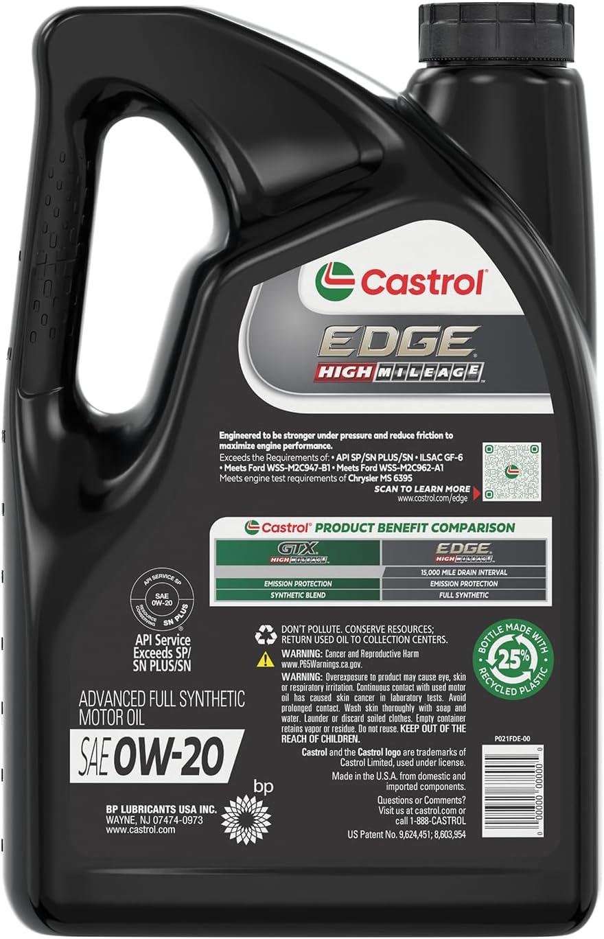 Castrol® EDGE® High Mileage 0W-20 is an advanced full synthetic motor oil that is specifically designed for vehicles with over 75,000 miles. It's been engineered to reduce leaks, burnoff and power robbing deposits, but also contains a proprietary additive to protect the emission system. Our Phosphorus Replacement Technology reduces harmful phosphorus to protect the catalytic converter and extend maximum performance. It is the natural choice for drivers who demand maximum performance from their high mileage car.