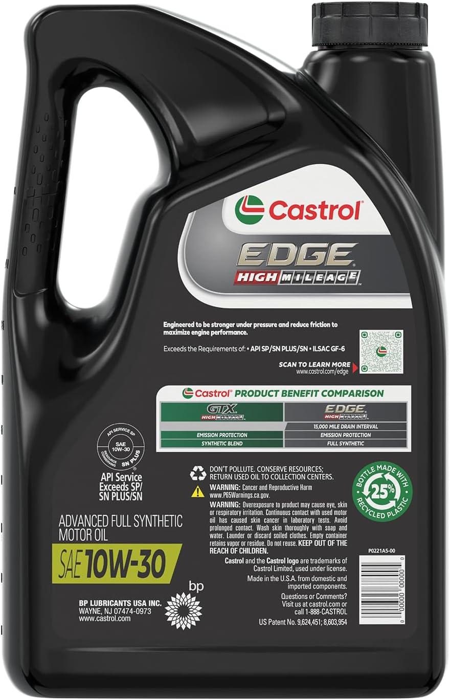 Castrol® EDGE® High Mileage 10W-30 is an advanced full synthetic motor oil that is specifically designed for vehicles with over 75,000 miles. It's been engineered to reduce leaks, burnoff and power robbing deposits, but also contains a proprietary additive to protect the emission system. Our Phosphorus Replacement Technology reduces harmful phosphorus to protect the catalytic converter and extend maximum performance. It is the natural choice for drivers who demand maximum performance from their high mileage car.