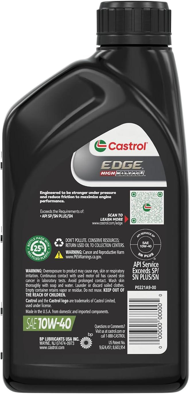 Castrol® EDGE® High Mileage 10W-40 is an advanced full synthetic motor oil that is specifically designed for vehicles with over 75,000 miles. It's been engineered to reduce leaks, burnoff and power robbing deposits, but also contains a proprietary additive to protect the emission system. Our Phosphorus Replacement Technology reduces harmful phosphorus to protect the catalytic converter and extend maximum performance. It is the natural choice for drivers who demand maximum performance from their high mileage car.