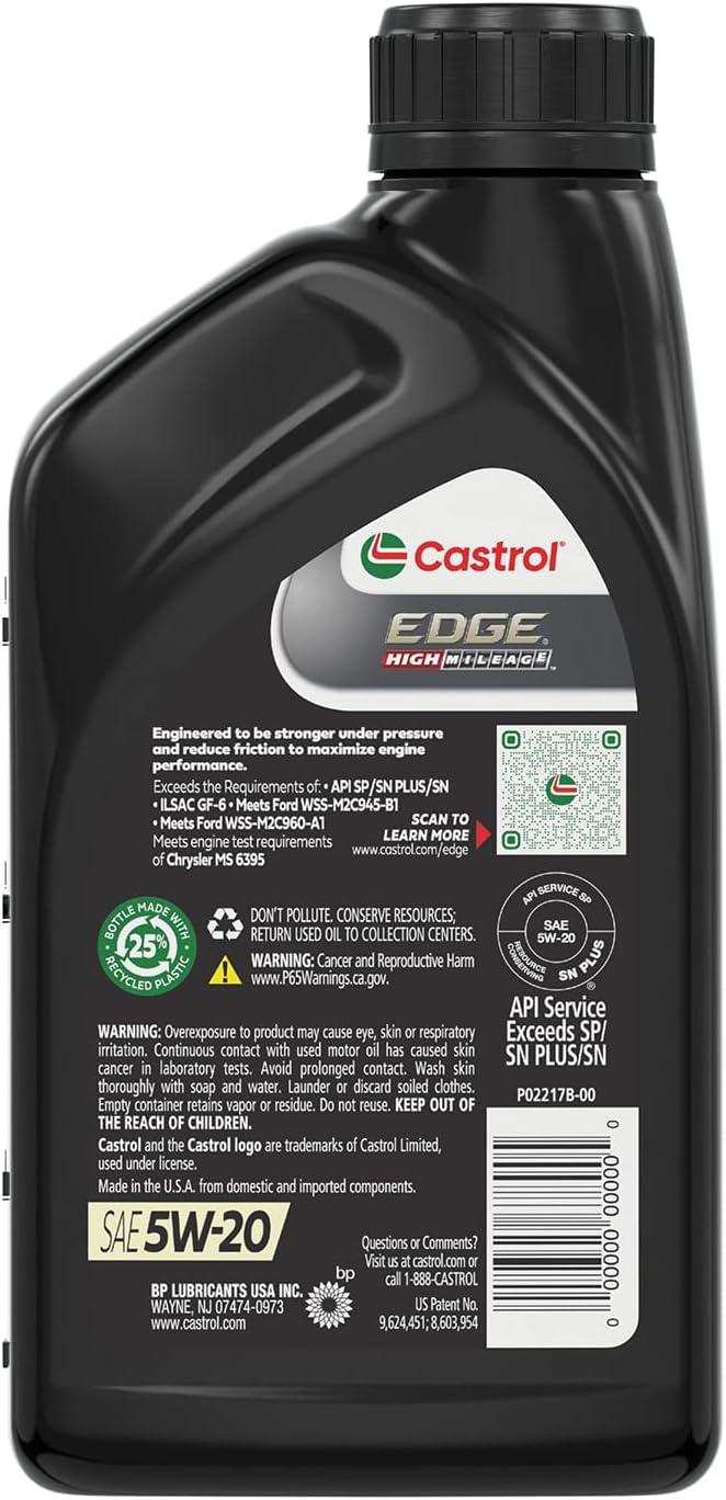 Castrol® EDGE® High Mileage 5W-20 is an advanced full synthetic motor oil that is specifically designed for vehicles with over 75,000 miles. It's been engineered to reduce leaks, burnoff and power robbing deposits, but also contains a proprietary additive to protect the emission system. Our Phosphorus Replacement Technology reduces harmful phosphorus to protect the catalytic converter and extend maximum performance. It is the natural choice for drivers who demand maximum performance from their high mileage car.