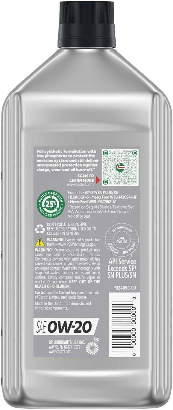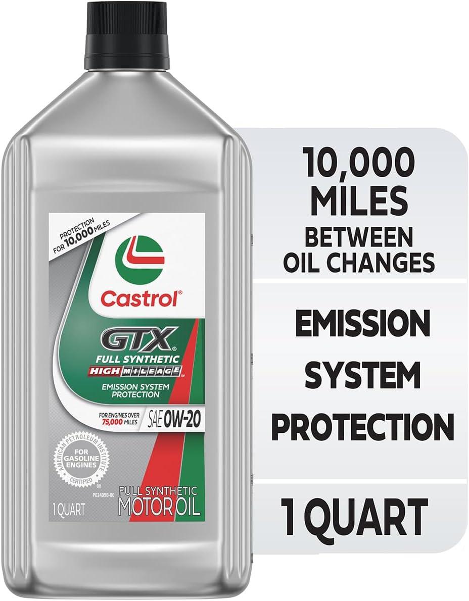 Castrol GTX Full Synthetic High Mileage 0W-20 Motor Oil, 1 Quart, Pack of 6
