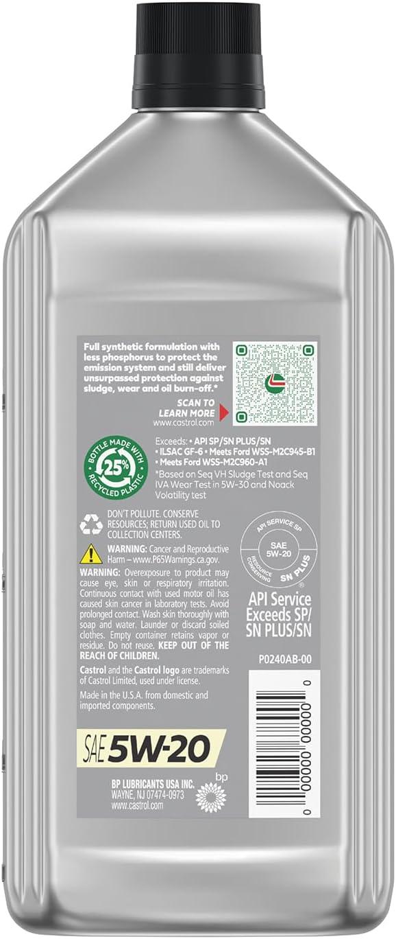 Castrol GTX Full Synthetic High Mileage 5W-20 Motor Oil, 1 Quart, Pack of 6