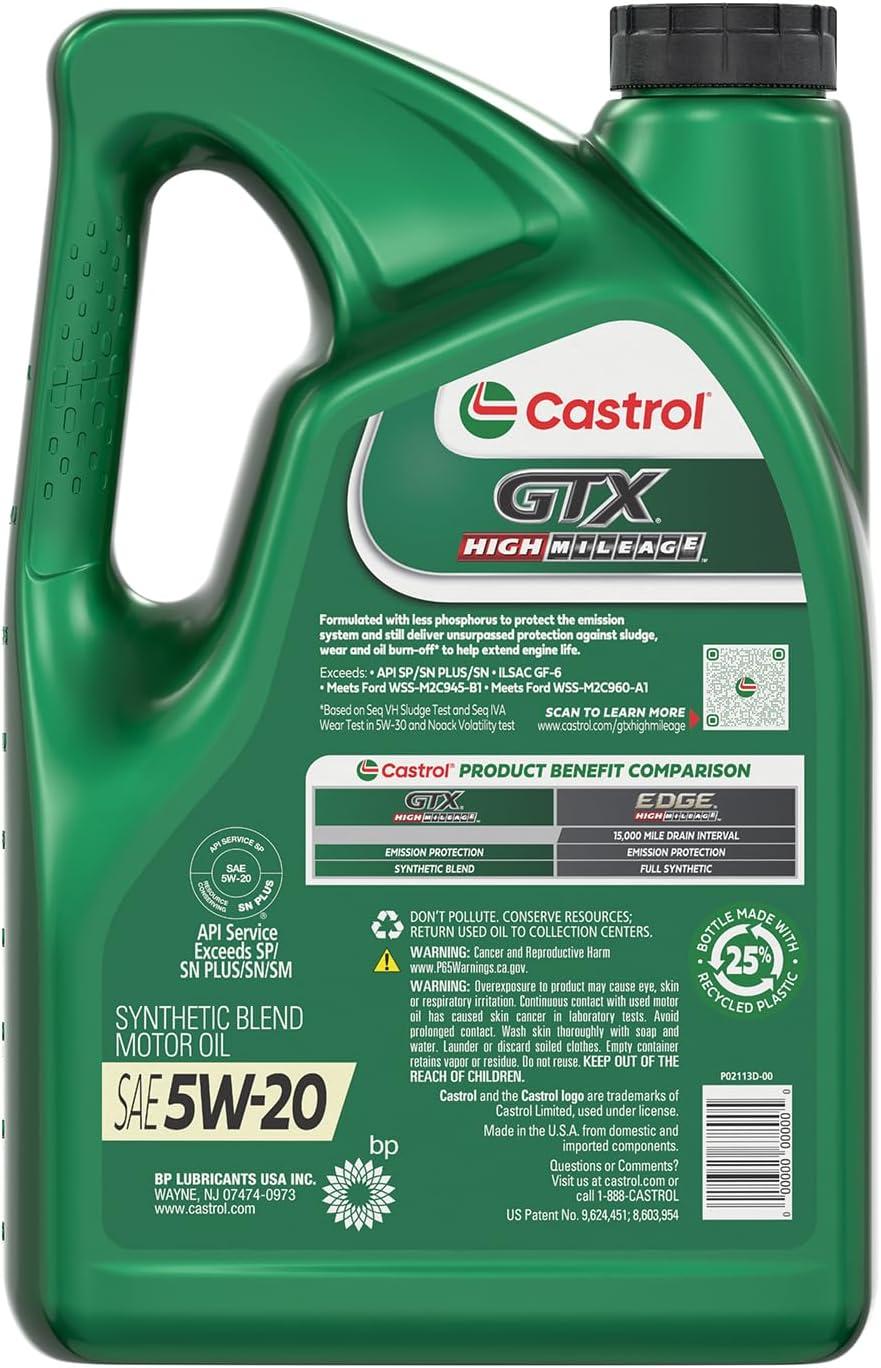 Castrol® GTX® High Mileage is the #1 consumer high-mileage brand. It's a synthetic blend engine oil that helps extend the life of engines by protecting against sludge, wear and burn-off. Engineered with Phosphorous Replacement Technology, it also protect emission systems by replacing some of the phosphorous that can damage catalytic converters.