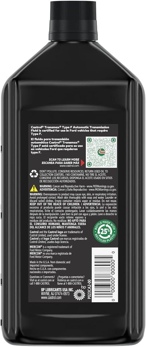 Castrol Transmax Type F is designed for use in older ford vehicles (pre 1982) requiring the unique friction characteristics of a type F transmission fluid. NB: Do not use in transmissions where a Mercon or Dexron type fluid is required